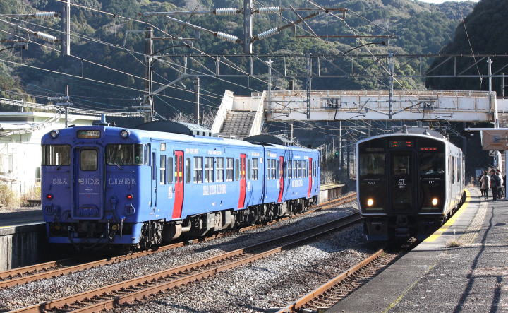 山間の現川駅到着、快速「シーサイドライナー」通過を待つ。