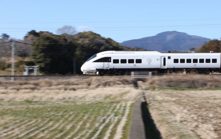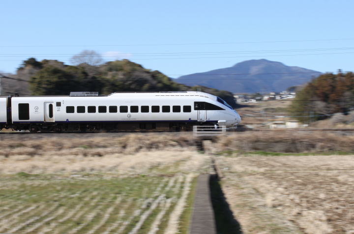 [動止]クモハ885 403→(博多駅方向) 冬の青空、遠くに多良岳を望む。