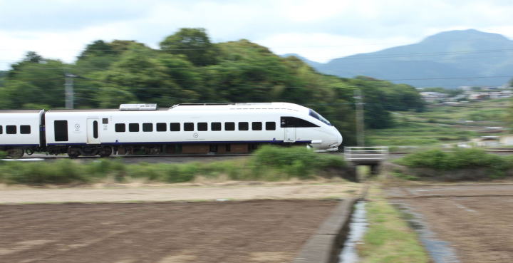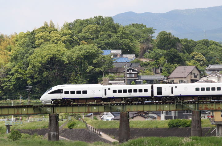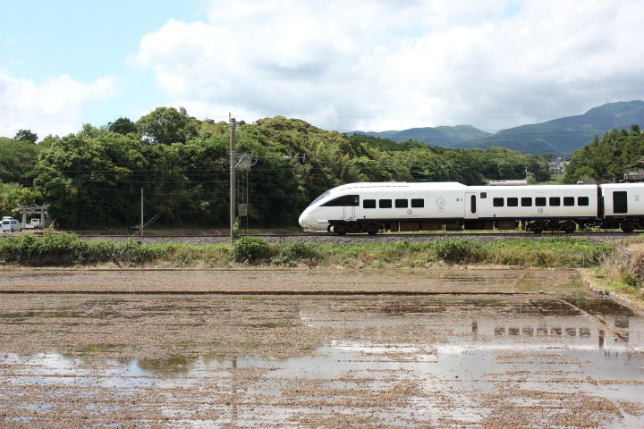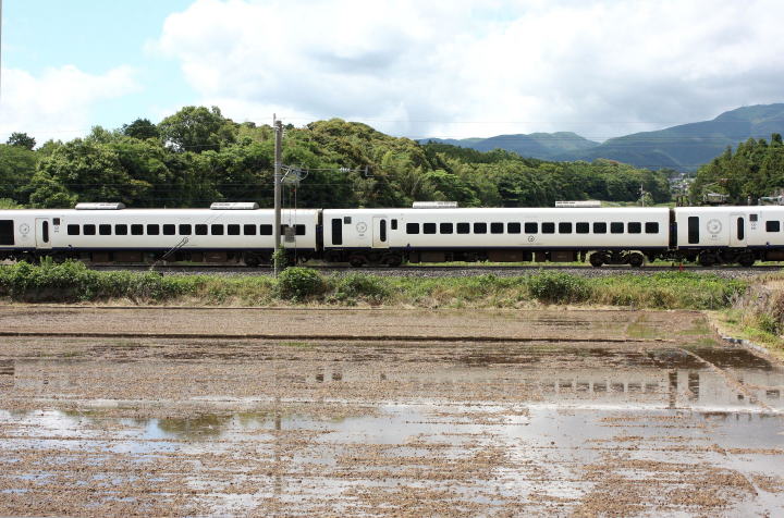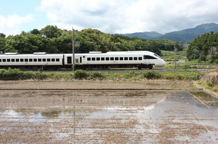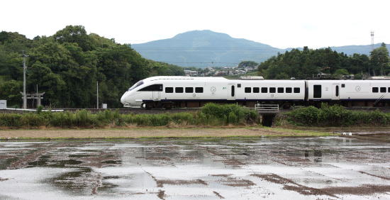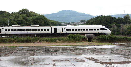 [動止]クモハ885 4→(博多駅方向) 梅雨前、遠くに多良岳を望む。