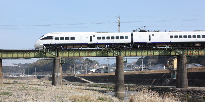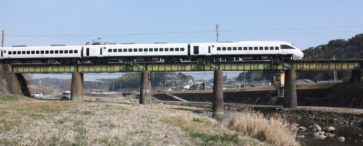 冬枯れの青空の下、白い車体が流れる。