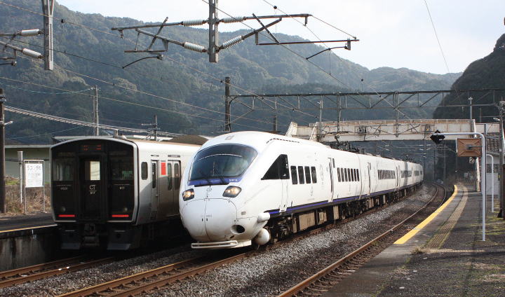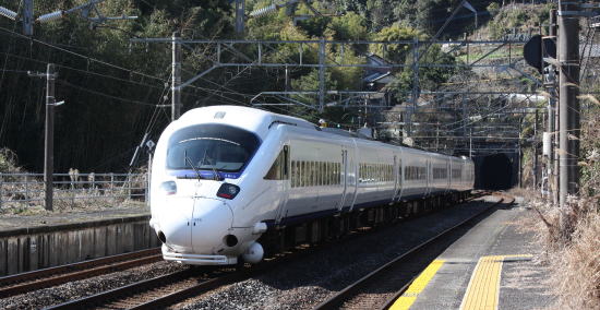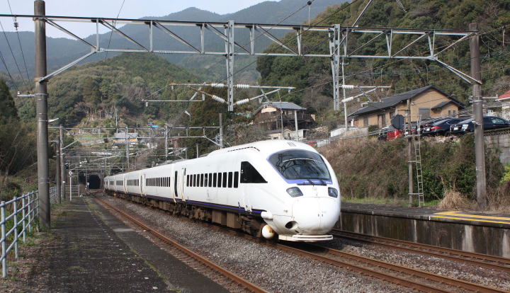 肥前古賀駅から長いトンネルを越え、山間の駅のカーブ・中線を高速で通過する。