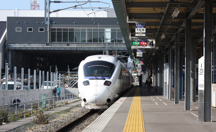 4番線ホーム屋根下には、885系白い「かもめ」、787系7,8輌編成「かもめ」の乗車口標識が並ぶ。