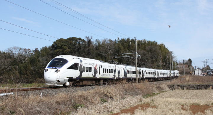 冬枯れの青空の下、ラッピングの白い車体が流れる。